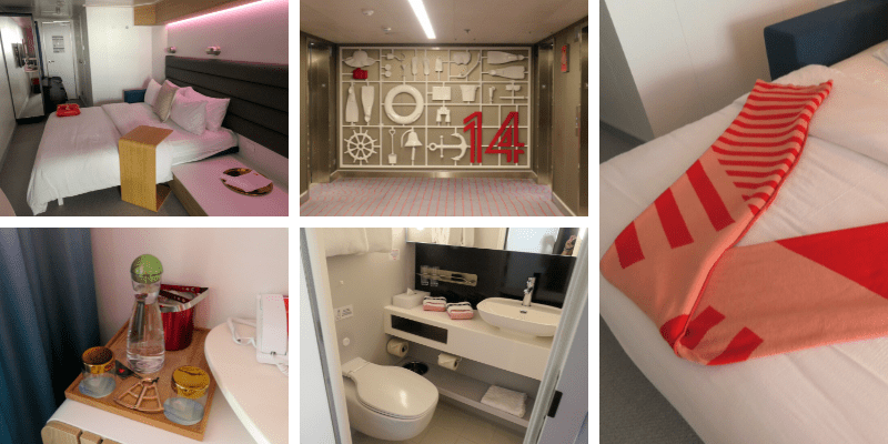 Our first stop was to our cabin. Our luggage was already inside and the room was ready for our arrival. There was a pitcher of cold water waiting for us and as we settled in, the doorbell rang. I had no idea cruise ships have doorbells! It was our cabin stewards introducing themselves to us. The cabin is a decent size. Our closet area was immediately to the right. There is a curtain to close the closet. There is an area to hang things with 10 hangers, an area above the pole to store bags, a double decker shoe rack at the bottom, and an enclosed area with shelving. The top shelf has the life jackets, the next shelf down has towels for our beach day at Bimini, the third shelf down a safe, and then four empty shelves. There was also a hair dryer in there. Across from the closet is the bathroom. It has a rain shower with three large bottles of shampoo, conditioner, and soap. As someone with long hair, this made me happy! Next to the sink was a bar of black soap and also make-up specific towels. Another luxury! Next in the cabin is the bed with the TV across then a chair and desk area. There is also a mini-fridge and one of the coolest bottle openers I’ve ever seen. Next, is a door to our balcony. The balcony has two chairs, a small table, and a hammock. The door was much easier to open than other ships I’ve sailed. I suppose with no kids there isn’t a reason to make it so hard to open!