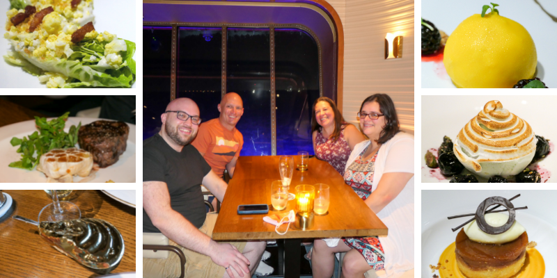 Before we knew it, it was time for our six o-clock dinner reservation at The Wake. This is the steakhouse onboard and it is located at the rear of the ship. We were seated next to a window that looked out to water. We witnessed the boat being untethered to the dock and saw the wake begin as we floated away from Miami. It was probably the best place on the ship to watch us leave! There was a deck bon voyage party at the pool, but we missed that for dinner. I’m kind of in an avoid people mentality on the ship so I wasn’t heartbroken to miss it. Dinner was very good, but not at the same caliber as the two restaurants we ate at in Miami. My sister-in-law and Brian both ordered the Clam Chowder and a nearly empty bowl was placed in front of them that did not contain soup. Brian muttered, “this isn’t want I expected.” I started to explain that they hadn’t poured the soup in it yet and we all erupted in laughter. I ordered the wedge salad which was delicious. For entrees, we had lamb, filet mignon, and salmon among the table. Oh there was also tear-away bread served in a skillet. That was good! The table also had the cutest pear-looking golden dish of salt and a mini fancy-room service thing for the butter. Dessert was my favorite. My sister-in-law ordered the Baked Alaska, my brother the lemon cheesecake, I ordered the wake which was a chocolate dish, and Brian had the an apple dessert. The lemon cheesecake wins for the most decorative. It looked like an actual lemon. It was so cute! Emily’s Baked Alaska was my favorite. It tasted like blue moon ice cream to me which was my childhood go-to ice cream flavor.