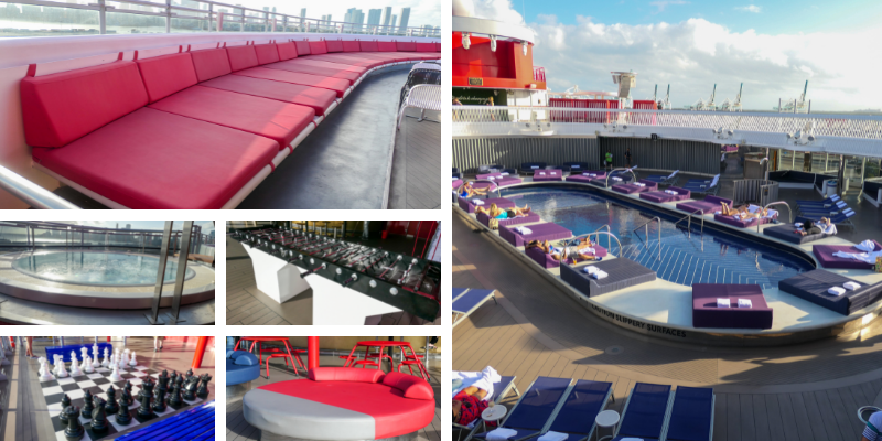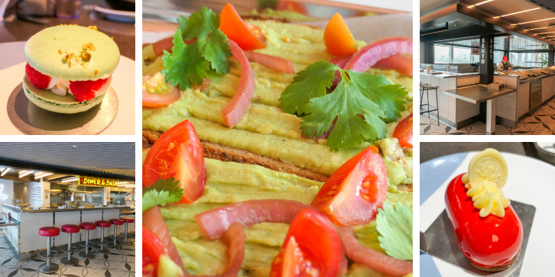 We’re all ravenous with hunger so food is next on the agenda. Virgin Voyages is known for their food and lack of buffets. We head to The Galley which is the dining hall most equivalent to other ship’s buffet. It is an area filled with little food stands and has a feel similar to North Market in Columbus or the Reading Terminal Market in Philadelphia. We were expecting to go up to the stand and order, but that’s not how it works. You choose a table and then a server comes by to take your order. Drinks and desserts you grab on your own. I ordered the Buffalo Mozzarella Panini with a side of fruit. I was a little disappointed that the fruit was honeydew melon, cantelope melon, and pineapple; BUT it turned out to be the best fruit. I don’t normally like honeydew melon at all, but this was nothing like the honeydew from your local grocery store. I gobbled it all. The sandwich was good too. I ordered it without tomato which ended up being a great choice. My brother ordered it normally and he said the sandwich was a little soggy with the tomato. Brian loved his avocado toast. My sister-in-law had a salad which looked amazing. The desserts were plentiful and we tried three different ones as a table: a red life-boat looking one filled with chocolate mousse, a pistachio giant macaron, and a passionfruit tart. The lifeboat was by far the favorite.