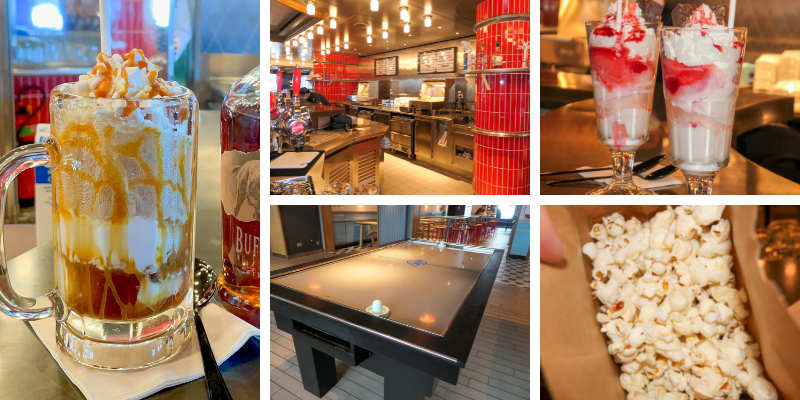 I met back up for Brian, and he was looking for a snack. I mentioned that I saw a snack stand with pretzels, his favorite, so we headed that way. The Social Room is a fun hangout located on Deck 7 and the Social Club Diner is an area that features classic carnival treats like popcorn, hot dogs, pretzels, candy, and floats. Brian ordered a pretzel that was served with cheese and popcorn. I ordered a confetti cake pop. After our snack, we moved to the arcade which is located around the corner from the diner. Here they have an awesome collection of old-school arcade games such as Donkey Kong, Mario Brothers, Pac Man, and Golden Tee. The best part of the arcade, it was free! All the games were set to free play mode and you could play for as long as you’d like. We were the only ones in the arcade too. After our games, we headed back next to the diner for air hockey. This was the first time I was really starting to feel the severity of the ship’s movements. I wasn’t feeling well so I headed back to the room for some motion sickness medicine.