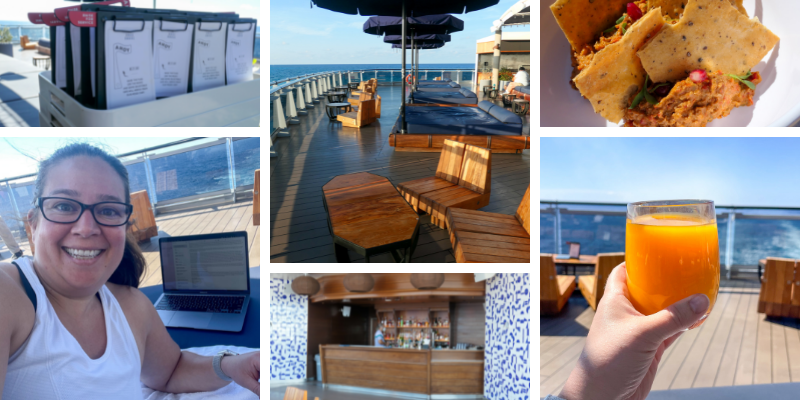 The Dock has a full alcoholic bar, a juice bar, and snacks. The juice bar featured fancy fresh juice similar to what you would find at Restore in Hudson. Over the next several hours, I tried several of the juices. Each was amazing. We were each sprawled out on a bed with umbrella and each bed had a tray for our drinks and a menu. The menu had a little red flag on it, and if you flipped it up, two crew members came by with a food cart. I have an allergy to peppers and up until this point the crew has been amazing with accommodating my allergy. As I looked at the food, they had a suspicious red tint to them that made me think that some form of pepper was used in them. The lady took my allergy inquiry seriously and messaged with someone on her device about if there were peppers in it. The person responded that it was pepper-free. I was still suspicious, but the dish also had pomegranates so it was conceivable that the red came from that. Still, I asked if she had an ingredient listing. She did and she showed it to me. Peppers were not listed in the ingredients so I took the box. I took one bite and 100% it had peppers in it. I gave the box to Brian. Luckily, a small dose of peppers doesn’t put me into anaphylactic shock so all was well minus a sore throat. Our whole time in this area, there was a DJ playing very mellow music. It all created a wonderful vibe. I found my favorite spot on the ship!