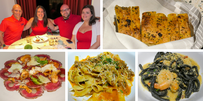 Dinner tonight was at Extra Virgin which is the Italian restaurant onboard. The menu was a little confusing on courses so we ended up ordering a ton of food. For my “antipasto” I ordered braised mini meatballs, for the “pasta” I ordered pappardelle al ragu, and for the “secondo” I ordered the Spatchcocked grilled young chicken. There was also bread for the table and an “affettati Misti” which was basically a charcuterie board. Since all the food is included, we felt compelled to order from each section of the menu for each meal. Most of the time this has worked pretty well, but it was way too much this time. If I had known how much food it was, I would have ordered a pasta or a main course, but not both. The food here was very good. I loved all three of my selections. Dessert was a disappointment thought. Maybe it was because I was already full, but I only took about one bite of the chocolate cake.