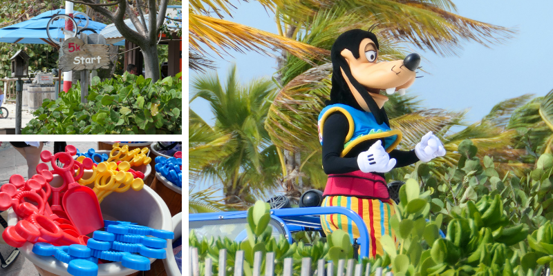 The tram brought us back to the main area. We walked around admiring the Disney decor and shops. Here we found the spot where the 5k starts! We didn’t participate for a variety of reasons. 1) We wanted to sleep in. 2) It was hot. 3) No one was chasing me. We also found a bunch of cute play areas. There was an area with a mini water park and also an area with a pirate-like playground located in the water. When we first drove by this area earlier in the day, there were several characters out greeting guests to the island. This time around, they weren’t around. I’m not sure if it was because of the forecast or if they are only around in the morning. Either way, see the characters when you see them, they might now be around later.