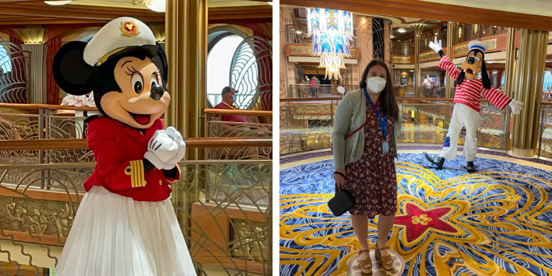 Disney characters are plentiful on a Disney Cruise. We saw them on the island and we saw many of them on the ship too! Due to Covid-19 policies, they interact from a little further away, but they are still entertaining! Mickey Mouse, Minnie Mouse, Goofy, Donald Duck, Stitch, Belle, Jasmine, and Tiana are the characters we saw onboard.