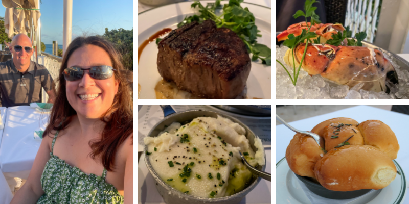 Lunch was at Skipper Canteen which is a restaurant that I’ve never tried. It reminds me of the old Adventureland lounge that used to be in Pleasure Island. I loved the vibe. I order an Adventureland Colada which is basically the drinkable version of a dole whip. It was delicious. We ordered the secret menu cheese bread as an appetizer and I had the steak for my entree. I have an allergy to peppers which is pretty much in every dish on the menu. Luckily, Disney is very accommodating and the chef came out to discuss which dishes can be modified to exclude peppers. I originally wanted the short ribs, but they are marinated over.a long time in peppers and wasn’t an option to make pepper-free. Instead, I ordered the steak without the seasoning and had It served with the sweet potato silk and a green bean/carrot mixture. It was a really delicious combo although a lot of food for lunch! I really enjoyed this meal.